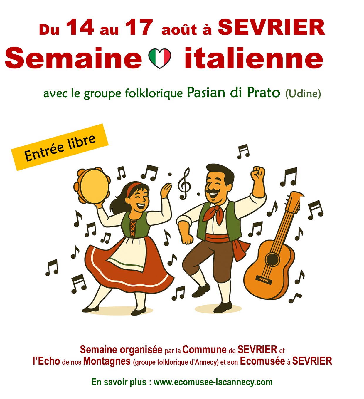 La 20e édition des Semaines européennes de Sevrier se vivra aux couleurs de l'Italie du 14 au 17 août ! Le groupe folklorique "Pasian di Prato" d'Udine (Italie) sera accueilli par la commune de Sevrier et le groupe folklorique annécien "L'Echo de nos Montagnes". Au programme : des chants, des danses, de la musique et des costumes de l'Italie du Nord, à découvrir au fil des spectacles et animations proposés en divers lieux du village (entrée libre).